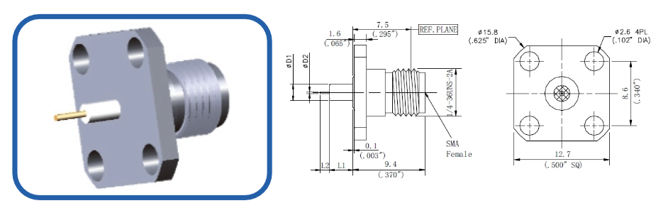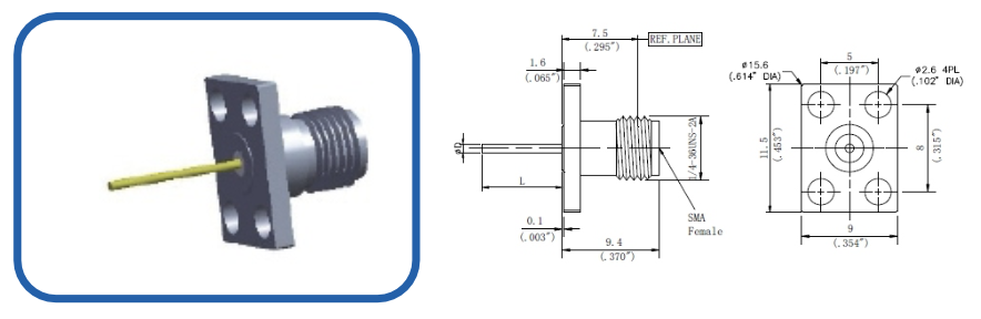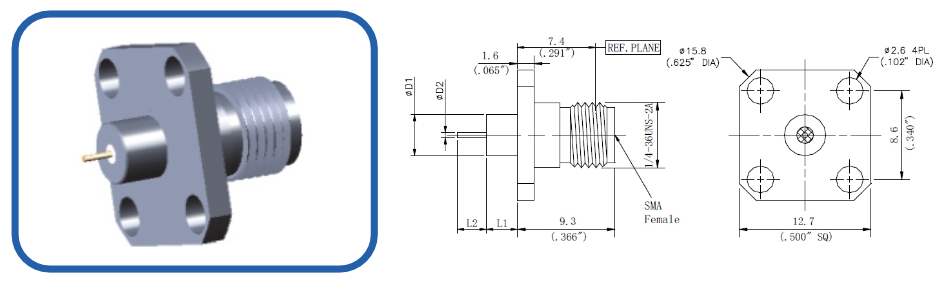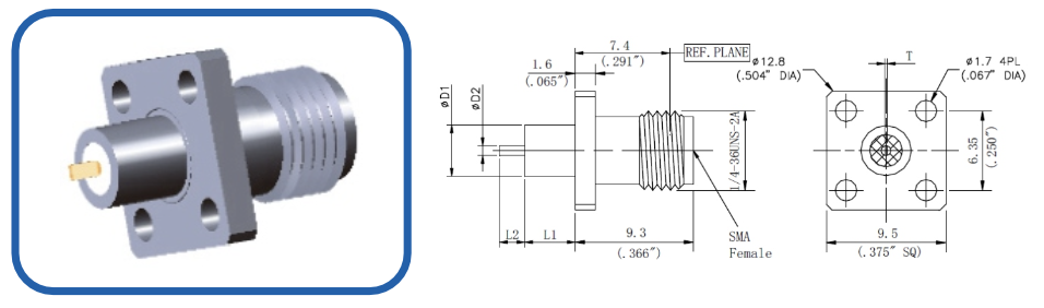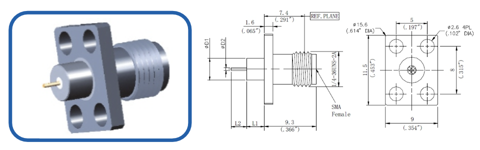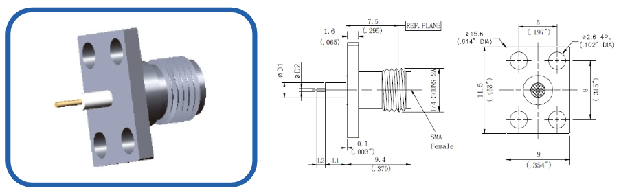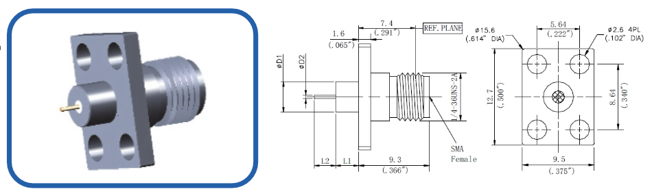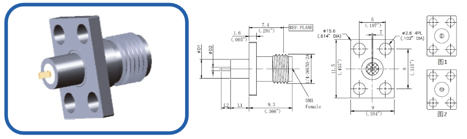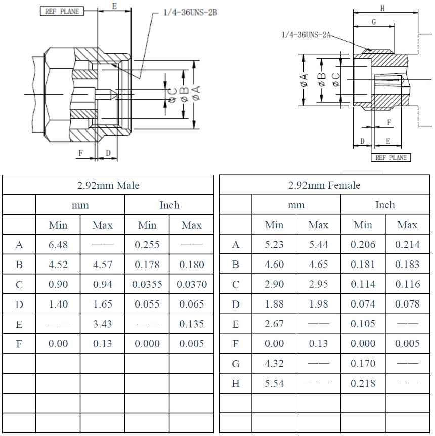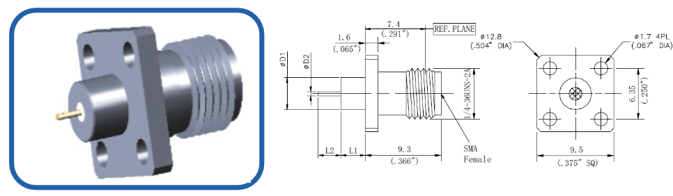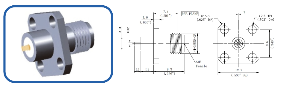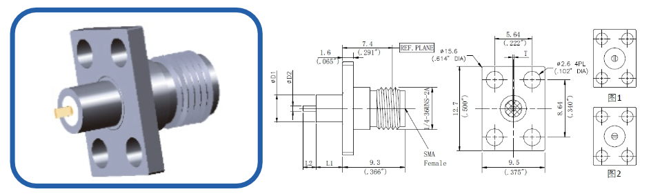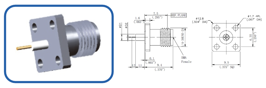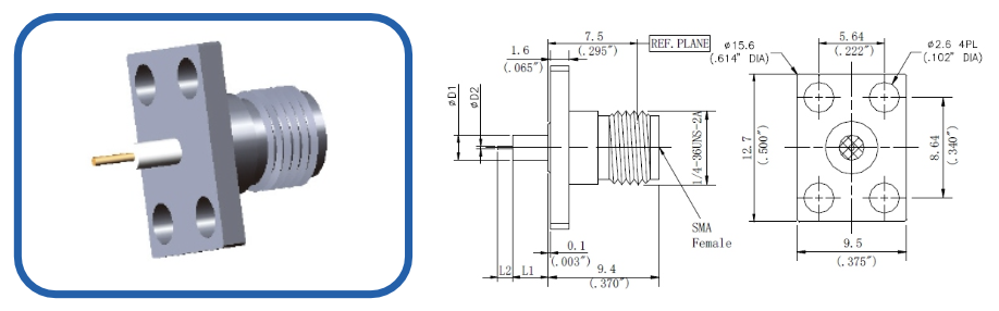 Email: sales@relcon.cn 首页 产品中心 联系我们 产品中心 首页>产品中心>穿墙/面板连接器系列 RELCON集科研、开发、制造及销售于一体,为航空、航天、兵器、船舶、电子、核工业、风电、轨道交通、新能源、机床、石油等领域提供专业、高效的服务 穿墙/面板连接器系列 PRODUCTS SMA系列 界面规格 SMA连接器是一种应用广泛的小型螺纹连接的射频同轴连接器,具有体积,频带宽,机械性能优异,可靠性高,使用寿命长等优点,最高使用频率 可达27GHz 界面尺寸 军友射频的SMA连接器,具有以下优势:1. 频率DC-27GHz2. 低电压驻波比3. 主体一体式设计,防止信号泄露4. 耐受温度可达165°C5. 不锈钢外导体,耐用性更优良 型号 频率/驻波比 D插孔直径 SMA-K-F4-01-A DC~18GHz/VSWR≤1.1018~27GHz/VSWR≤1.15 0.23mm/0.009" SMA-K-F4-02-A DC~18GHz/VSWR≤1.1018~27GHz/VSWR≤1.15 0.30mm/0.012" SMA-K-F4-03-A DC~18GHz/VSWR≤1.1018~27GHz/VSWR≤1.15 0.38mm/0.015" SMA-K-F4-04-A DC~18GHz/VSWR≤1.1018~27GHz/VSWR≤1.15 0.46mm/0.018" SMA-K-F4-05-A DC~18GHz/VSWR≤1.1018~27GHz/VSWR≤1.15 0.51mm/0.020" 型号 频率/驻波比 D插孔直径 SMA-K-F4-06-A DC~18GHz/VSWR≤1.1018~27GHz/VSWR≤1.15 0.23mm/0.009" SMA-K-F4-07-A DC~18GHz/VSWR≤1.1018~27GHz/VSWR≤1.15 0.30mm/0.012" SMA-K-F4-08-A DC~18GHz/VSWR≤1.1018~27GHz/VSWR≤1.15 0.38mm/0.015" SMA-K-F4-09-A DC~18GHz/VSWR≤1.1018~27GHz/VSWR≤1.15 0.46mm/0.018" SMA-K-F4-10-A DC~18GHz/VSWR≤1.1018~27GHz/VSWR≤1.15 0.51mm/0.020" 型号 频率/驻波比 D插孔直径 SMA-K-F4-11-A DC~18GHz/VSWR≤1.1018~27GHz/VSWR≤1.15 0.23mm/0.009" SMA-K-F4-12-A DC~18GHz/VSWR≤1.1018~27GHz/VSWR≤1.15 0.30mm/0.012" SMA-K-F4-13-A DC~18GHz/VSWR≤1.1018~27GHz/VSWR≤1.15 0.38mm/0.015" SMA-K-F4-14-A DC~18GHz/VSWR≤1.1018~27GHz/VSWR≤1.15 0.46mm/0.018" SMA-K-F4-15-A DC~18GHz/VSWR≤1.1018~27GHz/VSWR≤1.15 0.51mm/0.020" 型号 频率/驻波比 D插孔直径 SMA-K-F4-16-A DC~18GHz/VSWR≤1.1018~27GHz/VSWR≤1.15 0.23mm/0.009" SMA-K-F4-17-A DC~18GHz/VSWR≤1.1018~27GHz/VSWR≤1.15 0.30mm/0.012" SMA-K-F4-18-A DC~18GHz/VSWR≤1.1018~27GHz/VSWR≤1.15 0.38mm/0.015" SMA-K-F4-19-A DC~18GHz/VSWR≤1.1018~27GHz/VSWR≤1.15 0.46mm/0.018" SMA-K-F4-20-A DC~18GHz/VSWR≤1.1018~27GHz/VSWR≤1.15 0.51mm/0.020" 型号 频率/驻波比 D插孔直径 SMA-K-F4-21-A DC~18GHz/VSWR≤1.1018~27GHz/VSWR≤1.15 0.91mm/0.036" 型号 频率/驻波比 D插孔直径 SMA-K-F4-22-A DC~18GHz/VSWR≤1.1018~27GHz/VSWR≤1.15 0.91mm/0.036" 型号 D尺寸 L长度尺寸 SMA-K-F4-23-A 0.64mm/0.025" 18mm/0.71" SMA-K-F4-24-A 0.87mm/0.034" 26mm/1.024" SMA-K-F4-25-A 0.87mm/0.034" 10.92mm/0.430" 型号 D尺寸 L长度尺寸 SMA-K-F4-26-A 0.64mm/0.025" 18mm/0.71" SMA-K-F4-27-A 0.87mm/0.034" 26mm/1.024" SMA-K-F4-28-A 0.87mm/0.034" 10.92mm/0.430" 型号 D尺寸 L长度尺寸 SMA-K-F4-29-A 0.64mm/0.025" 18mm/0.71" SMA-K-F4-30-A 0.87mm/0.034" 26mm/1.024" SMA-K-F4-31-A 0.87mm/0.034" 10.92mm/0.430" 型号 D尺寸 L长度尺寸 SMA-K-F4-32-A 0.64mm/0.025" 18mm/0.71" SMA-K-F4-33-A 0.87mm/0.034" 26mm/1.024" SMA-K-F4-34-A 0.87mm/0.034" 10.92mm/0.430" 型号 D尺寸 L长度尺寸 SMA-K-F4-35-A 1.27mm/0.05" 2.3/0.090" 型号 D尺寸 L长度尺寸 SMA-K-F4-36-A 1.27mm/0.05" 2.3/0.090" 型号 D尺寸 L长度尺寸 SMA-K-F4-37-A 1.27mm/0.05" 2.3/0.090" 型号 D尺寸 L长度尺寸 SMA-K-F4-38-A φD1(4.1mm/0.161")φD2(1.27mm/0.05") L1(3.17mm/0.125")L2(1.57mm/0.062") SMA-K-F4-39-A φD1(4.1mm/0.161")φD2(1.27mm/0.05") L1(5mm/0.197")L2(2mm/0.079") SMA-K-F4-40-A φD1(4.1mm/0.161")φD2(1.27mm/0.05") L1(5mm/0.197")L2(2mm/0.079") 型号 D尺寸 L长度尺寸 SMA-K-F4-41-A φD1(4.1mm/0.161")φD2(1.27mm/0.05") L1(3.17mm/0.125")L2(1.57mm/0.062") SMA-K-F4-42-A φD1(4.1mm/0.161")φD2(1.27mm/0.05") L1(5mm/0.197")L2(2mm/0.079") SMA-K-F4-43-A φD1(4.1mm/0.161")φD2(1.27mm/0.05") L1(5mm/0.197")L2(2mm/0.079") 型号 D尺寸 L长度尺寸 SMA-K-F4-43-A φD1(4.1mm/0.161")φD2(1mm/0.039") L1(4mm/0.158")L2(1.5mm/0.059") 型号 D尺寸 L长度尺寸 SMA-K-F4-44-A φD1(4.1mm/0.161")φD2(1.27mm/0.05") L1(3.17mm/0.125")L2(1.57mm/0.062") SMA-K-F4-45-A φD1(4.1mm/0.161")φD2(1.27mm/0.05") L1(5mm/0.197")L2(2mm/0.079") SMA-K-F4-46-A φD1(4.1mm/0.161")φD2(1.27mm/0.05") L1(5mm/0.197")L2(2mm/0.079") 型号 D尺寸 L长度尺寸 SMA-K-F4-47-A φD1(4mm/0.158")φD2(0.8mm/0.031") L1(4mm/0.158")L2(2mm/0.079") SMA-K-F4-48-A φD1(4mm/0.158")φD2(0.38mm/0.015") L1(3mm/0.118")L2(2mm/0.079") SMA-K-F4-49-A φD1(4mm/0.158")φD2(0.38mm/0.015") L1(3mm/0.118")L2(3mm/0.079") SMA-K-F4-50-A φD1(4mm/0.158")φD2(0.38mm/0.015") L1(3mm/0.118")L2(0.4mm/0.079") 型号 D尺寸 L长度尺寸 SMA-K-F4-51-A φD1(4mm/0.158")φD2(0.8mm/0.031") L1(4mm/0.158")L2(2mm/0.079") SMA-K-F4-52-A φD1(4mm/0.158")φD2(0.38mm/0.015") L1(3mm/0.118")L2(2mm/0.079") SMA-K-F4-53-A φD1(4mm/0.158")φD2(0.38mm/0.015") L1(3mm/0.118")L2(3mm/0.079") SMA-K-F4-54-A φD1(4mm/0.158")φD2(0.38mm/0.015") L1(3mm/0.118")L2(4mm/0.079") 型号 D尺寸 L长度尺寸 SMA-K-F4-55-A φD1(4mm/0.158")φD2(0.8mm/0.031") L1(4mm/0.158")L2(2mm/0.079") SMA-K-F4-56-A φD1(4mm/0.158")φD2(0.38mm/0.015") L1(3mm/0.118")L2(2mm/0.079") SMA-K-F4-57-A φD1(4mm/0.158")φD2(0.38mm/0.015") L1(3mm/0.118")L2(3mm/0.079") SMA-K-F4-58-A φD1(4mm/0.158")φD2(0.38mm/0.015") L1(3mm/0.118")L2(0.4mm/0.079") 型号 D尺寸 L长度尺寸 SMA-K-F4-59-A φD1(4mm/0.158")φD2(0.8mm/0.031") L1(4mm/0.158")L2(2mm/0.079") SMA-K-F4-60-A φD1(4mm/0.158")φD2(0.38mm/0.015") L1(3mm/0.118")L2(2mm/0.079") SMA-K-F4-61-A φD1(4mm/0.158")φD2(0.38mm/0.015") L1(3mm/0.118")L2(3mm/0.079") SMA-K-F4-62-A φD1(4mm/0.158")φD2(0.38mm/0.015") L1(3mm/0.118")L2(0.4mm/0.079") 型号 D尺寸 L长度尺寸 SMA-K-F4-63-A φD1(4mm/0.158")φD2(0.8mm/0.031") L1(4mm/0.158")L2(1.5mm/0.059") 型号 D尺寸 L长度尺寸 SMA-K-F4-64-A φD1(4mm/0.158")φD2(0.8mm/0.031") L1(4mm/0.158")L2(1.5mm/0.059") 型号 D尺寸 L长度尺寸 SMA-K-F4-65-A φD1(4mm/0.158")φD2(0.8mm/0.031") L1(4mm/0.158")L2(1.5mm/0.059") 型号 D尺寸 L长度尺